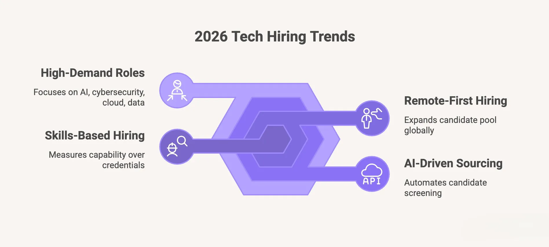 The latest hiring trends in the tech industry point to four clear shifts: AI-driven sourcing is replacing manual screening, demand is concentrating in AI/ML, cybersecurity, cloud, and data roles, remote-first hiring has become the default for most tech positions, and skills-based assessments are replacing credential checks across the board. Each of these trends changes something specific about how you source, evaluate, and close candidates.